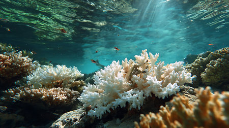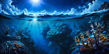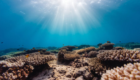 Colorful corals and marine life flourish in the depths of a sunlit ocean, showing underwater biodiversity.