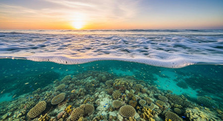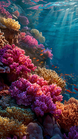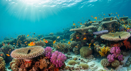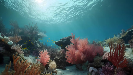 Stunning underwater shot showcasing a thriving coral reef teeming with diverse life. Experience the vibrant colors and intricate details of this aquatic world.