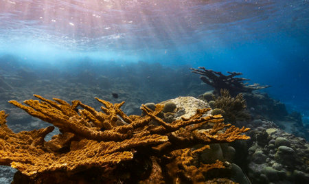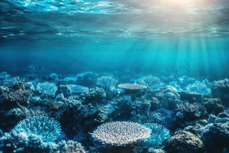 Underwater view of a tropical coral reef with sunlight and sunbeams