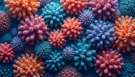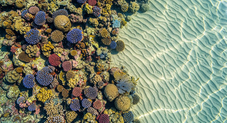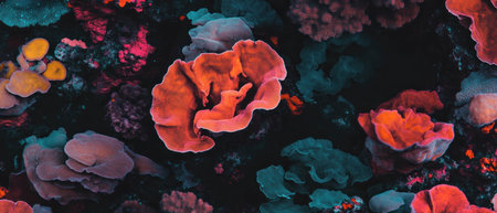 Cinematic pattern texture of a vibrant coral reef viewed from above showcasing marine life diversity