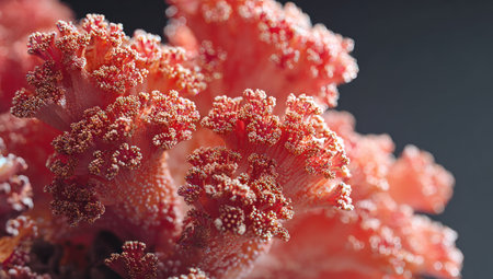 Close up of a red coral with many small bumps. The coral is pink and has a fuzzy texture