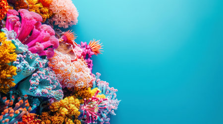 A stunning arrangement of coral and marine life featuring various shapes and colors against a soothing aqua backdrop, perfect for tropical themes and marine education.
