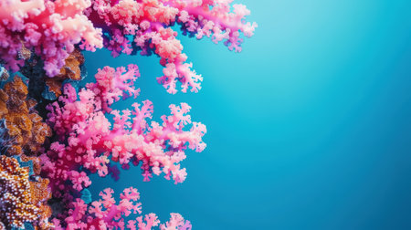 Aesthetic oceanic colorful fluorescent coral reef on blue background. Copy space. Aquarium hobby. Generative AI.