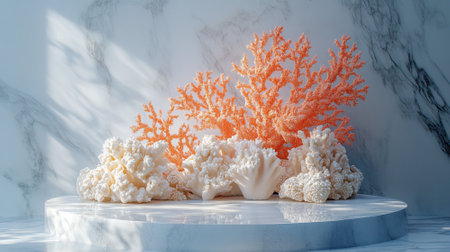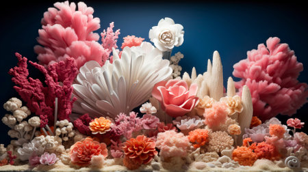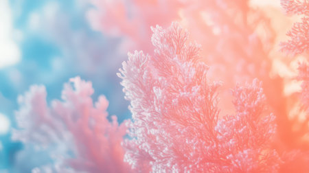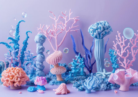A vibrant composition featuring coral reef sculptures in various colors, set against a soft gradient background, creating a visually appealing and artistic display.
