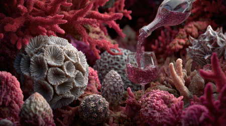 An artistic composition presents a wine bottle pouring into a glass, set within a colorful environment. The image features coral formations in shades of red and tan. The lighting suggests an underwater or artificial setting. Suitable for various creative and commercial applications.