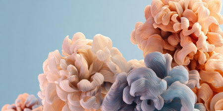 Soft, swirling flowers in shades of peach, pink, and blue emerge from a light blue background. The flowers exhibit intricate textures and curves, creating a serene composition.