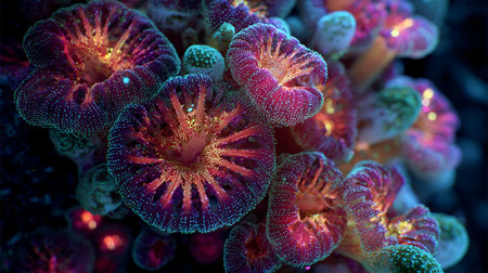 Experience the enchanting beauty of vibrant bioluminescent coral flowers glowing in a dark aquatic setting, capturing the wonders of marine life and organic design.