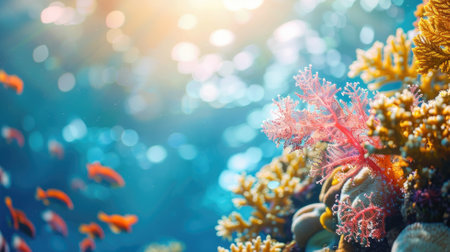 Vibrant underwater coral reef scene with sunlight and fish