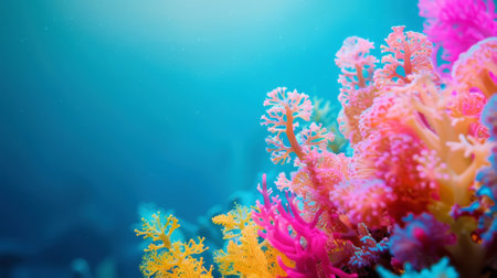 Aesthetic oceanic colorful fluorescent coral reef on blue background. Copy space. Aquarium hobby. Generative AI.