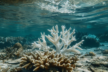A serene underwater view reveals a diverse coral reef with white coral structures thriving among sandy substrates, illuminated by sunlight filtering through clear water.
