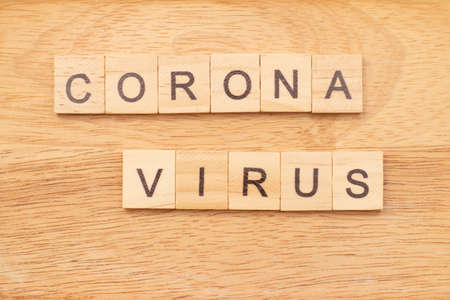 The inscription corona virus on a wooden background, top view. The epidemic of the covid-19 virus. Wooden cubes with letters.