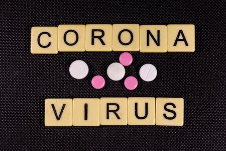 Antibiotic pills on black background. Healthcare and medicine concept. Coronavirus inscription