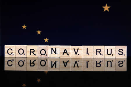 WROCLAW, POLAND - MARCH 28, 2020: Word CORONAVIRUS made of wooden letters, and Alaska State Flag and in the background. Coronavirus (COVID-19) global disease 2020.