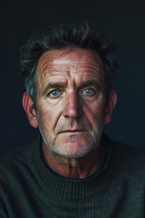 An elderly man with gray, tousled hair shows a joyful smile. His blue eyes reflect warmth and kindness, and deep wrinkles on his face tell a story of a life lived fully.