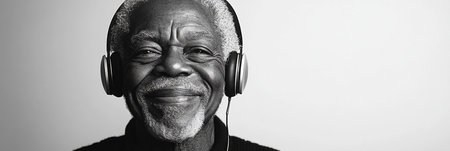 Afroamerican grandpa wearing headphones against a monochrome white and black background, mock-up, clean and simple and elegant