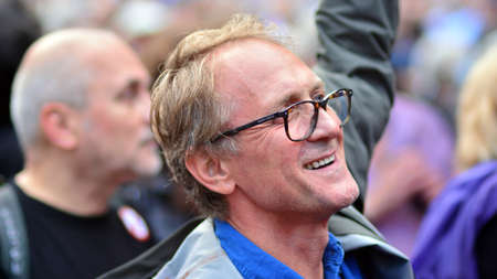 A closeup picture of a middle-aged man, in his 50s, with grey hair and glasses. Blue hazy sky in the background