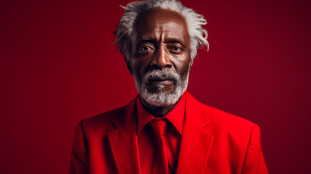 Handsome elegant, elderly African American man, on a red background, banner, close-up, copy space. Advertising of cosmetic products, spa treatments, shampoos and hair care products, dentistry and medicine, perfumes and cosmetology for senior men.