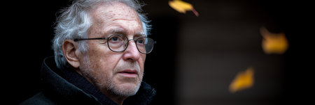 A close-up, outdoor portrait captures an elderly man with a salt-and-pepper beard and wrinkled face, illuminated by golden hour sunlight.