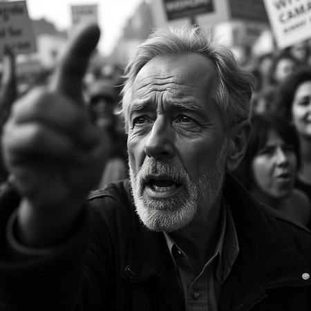 Elderly man with glasses and a red cap stands amidst a diverse group of protesters in a city, expressing his views in cold weather. The crowd shows unity in a peaceful demonstration for change.