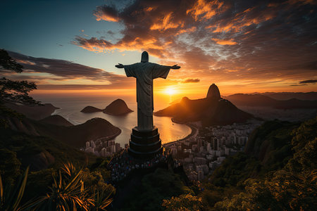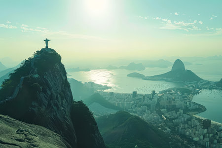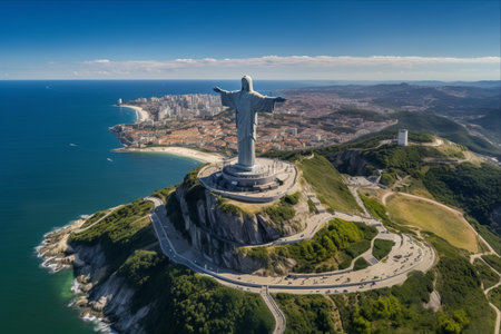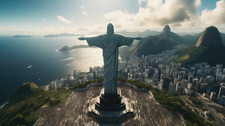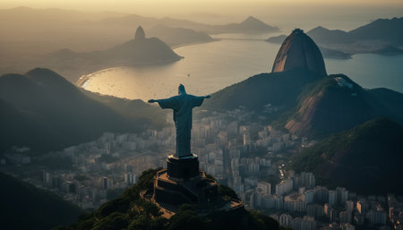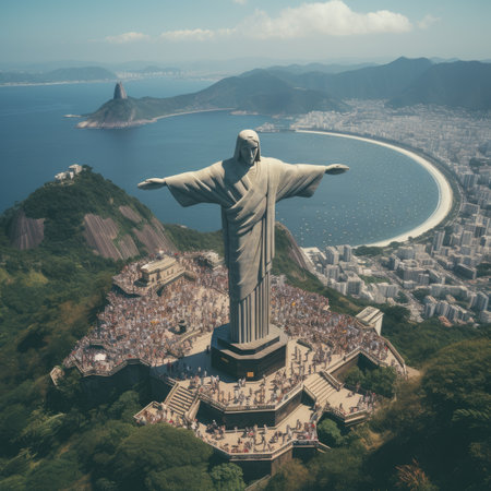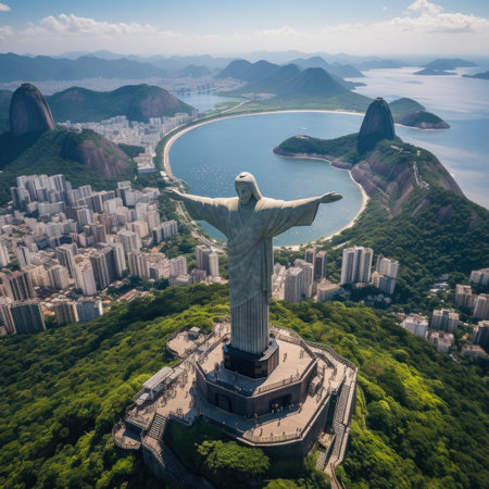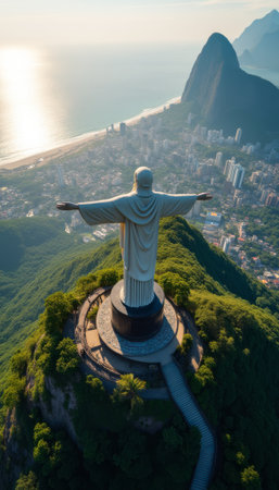The iconic Christ the Redeemer statue stands tall on Corcovado Mountain, arms outstretched, embracing the breathtaking view of Rio de Janeiro below. This stunning aerial perspective captures the vibrant cityscape, lush greenery, and the dramatic Sugarloaf Mountain in the distance, evoking a sense of awe and reverence.