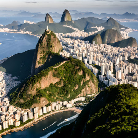 Aerial view of the iconic Cristo Redentor statue overlooking Rio de Janeiro, with the cityscape and Sugarloaf Mountain in the background. No people included.