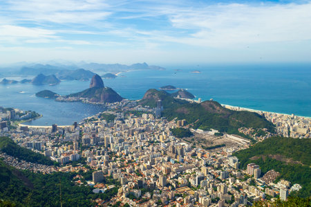 Rio de Janeiro Panorama View of the City Skyline Beaches Beach Coast Sea Mountains Tropical Forest and Blue Cloudy Sky in State of Rio de Janeiro Brazil.