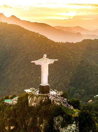 Jesus Christ statue on top of the mountain at sunset, Rio de Janeiro
