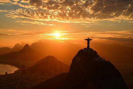 Sun setting behind Christ the Redeemer, Rio, view of Aerial of Christ and Sugar Loaf Mountain at sunset Ai generated