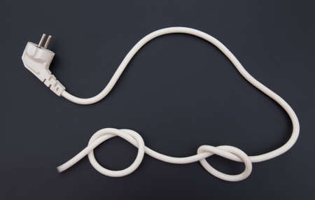 Black tangled cable lying on a smooth light surface with intricate knots and twisted loops, minimalistic modern composition.