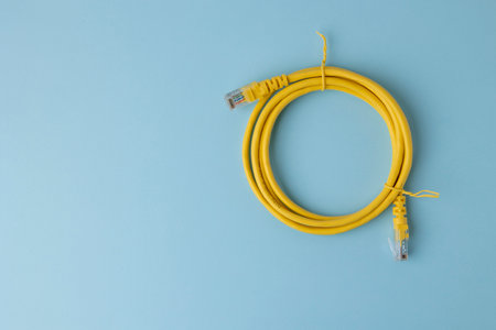 View from above of long USB-C Cable manufactured for fast data and peripheral transmission - isolated on blue background