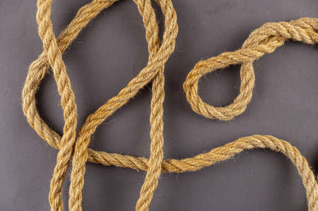The yellow ship rope against the gray background. The twisted rope is random. top view. abstract background