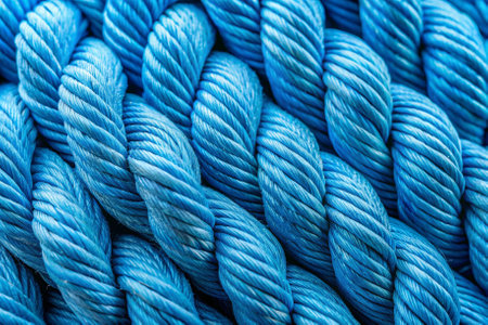 This close-up image captures the intricate texture of twisted rope against a soft blue background, showcasing its detailed fiber structure and strength.