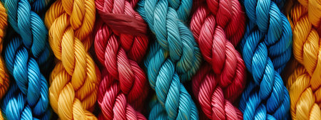 Close-up view of braided ropes in vivid blue, pink, and orange colors showcasing the intricate texture and interwoven design, symbolizing strength, unity, and resilience, making it ideal for creative concepts and stock photography. Generative AI