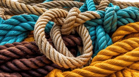 Diverse ropes symbolize teamwork and unity in a corporate setting showing cooperation and collaboration among team members. Concept Corporate Unity, Teamwork Symbol, Diverse Ropes