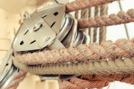Closeup on wooden deck tackle marine rigging and ropes background