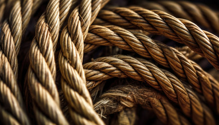 Macro shot of thick, intertwined brown ropes, capturing the detailed texture and fibers, creating a strong and rugged visual effect.