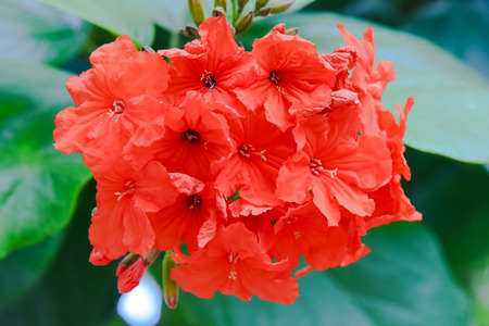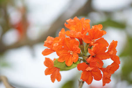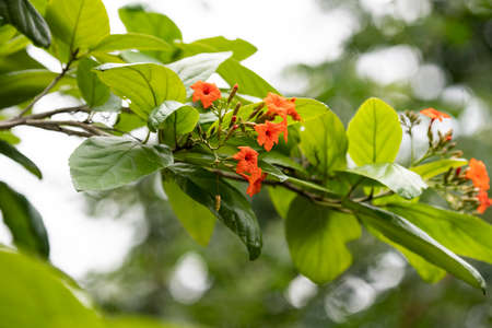 Beautiful orange flower, Cordia sebestena (Geiger tree) on the tree among green leaves blur background, in Thailand. Macro.
