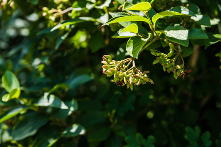 Branch of viburnum burejaeticum with clusters of immature green berries, lush foliage hinting at ripeness, displaying wild elegance and seasonal transition.