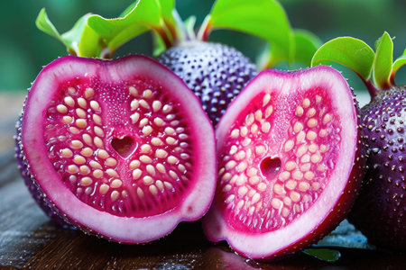 Fresh guava fruit on wooden table with green nature background, selective focus