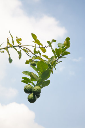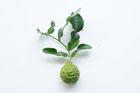 Fresh Bergamot fruits or Kaffir Lime fruits with leaf on tree in sky background.