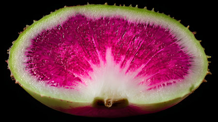 A watermelon radish half showing vivid magenta interior with white core and pale green rind, close up texture and fresh vegetable detail