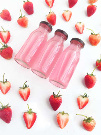Bottled of strawberry juice in Top view .