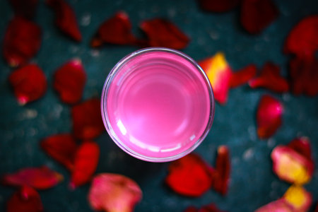 Rose water in a glass with rose petals on a blue background