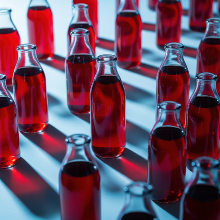 Multiple red liquid filled glass bottles isolated on white background