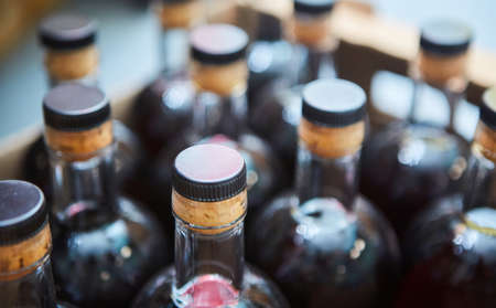 Bottles of alcoholic beverages in a box.