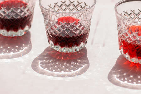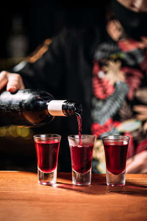 Red, strong alcoholic drink in small glasses on bar waiting to be served