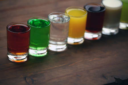 Drink shots in a row on the table in restaurant