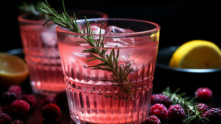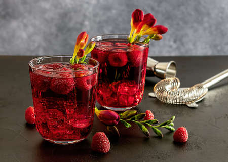 Fresh berries cocktail with gin, raspberry, soda water, and ice in glass on dark background. Summer cold alcohol drink. copy space