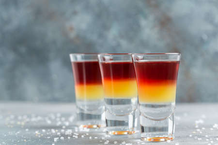 Three layered shots. Set of cocktails at the bar. alcoholic cocktail shot.