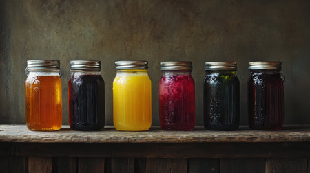 Colorful jars of freshly made fruit juice displayed on rustic wooden table in cozy kitchen